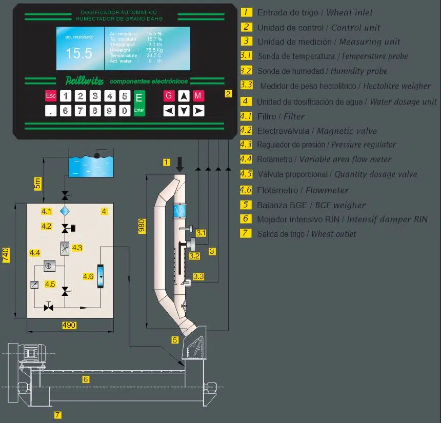 On the other hand, the DAM doser doses the water manually, taking into account the amount of grain flowing and its moisture, which must have been previously measured in the laboratory.